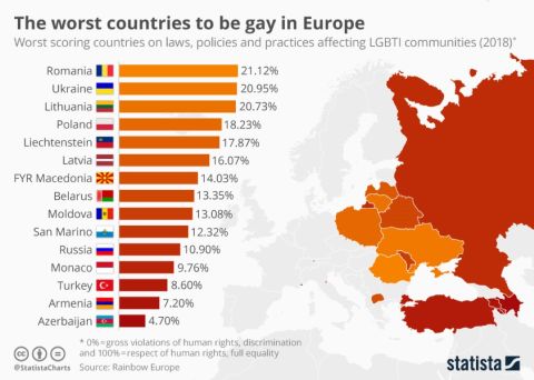Pentru mai multe detalii poți citi următorul articol: https://www.statista.com/chart/14134/the-worst-countries-to-be-gay-in-europe/